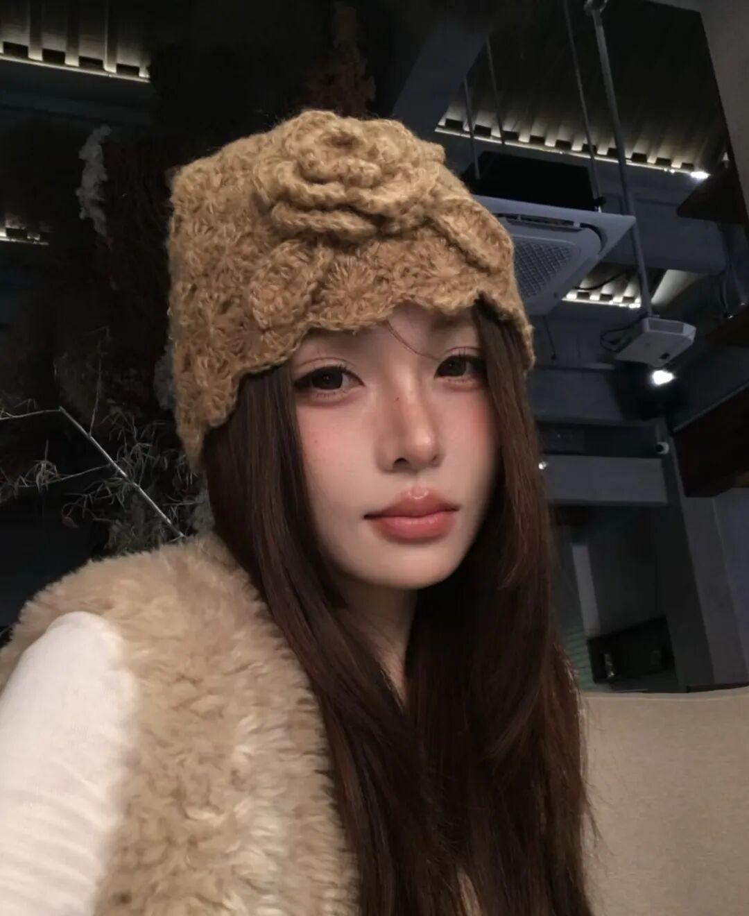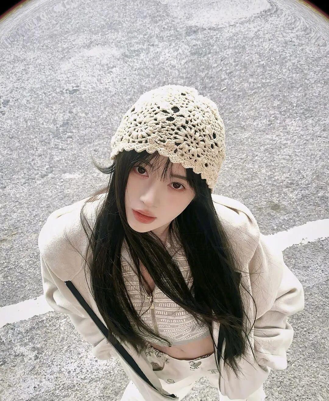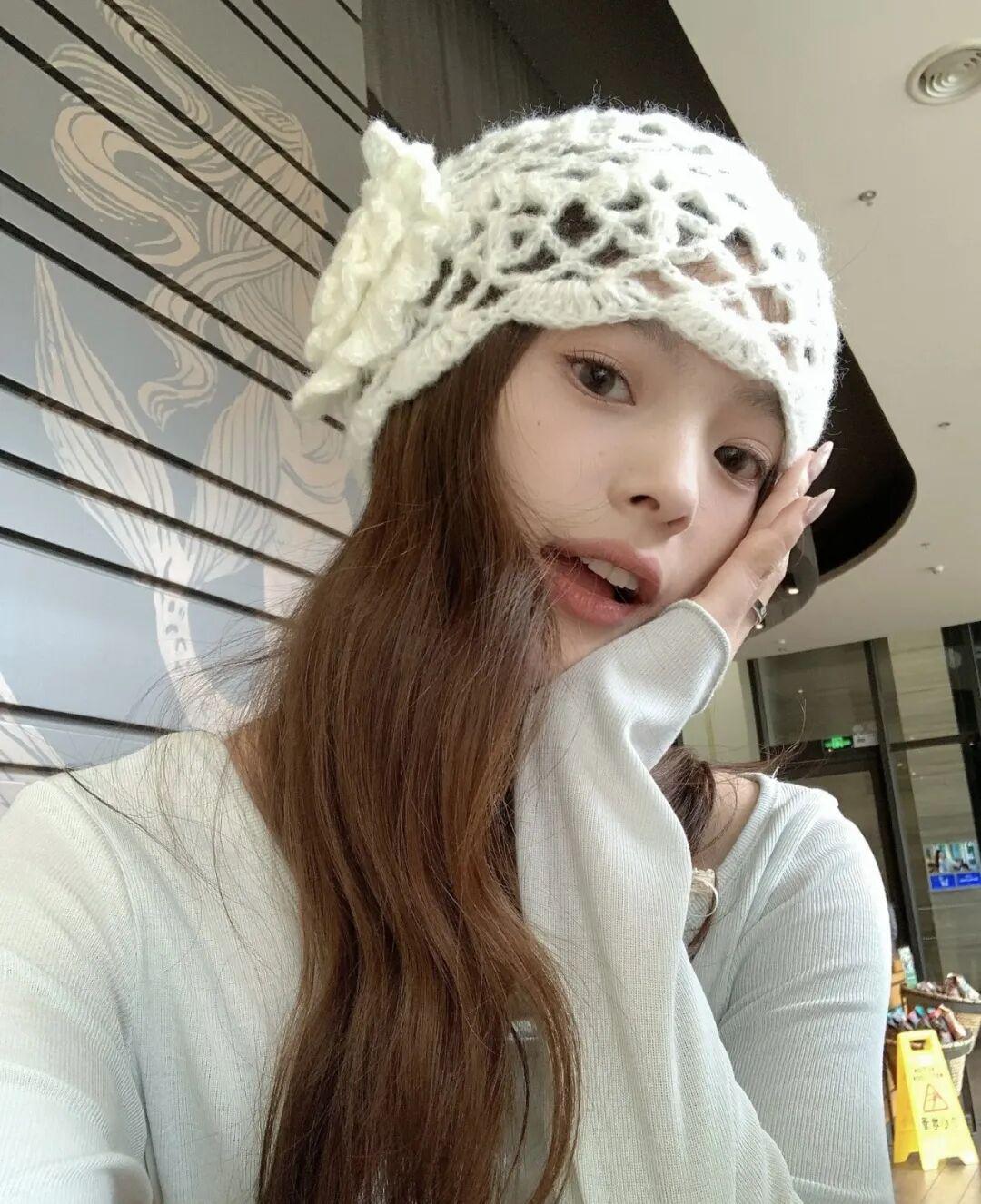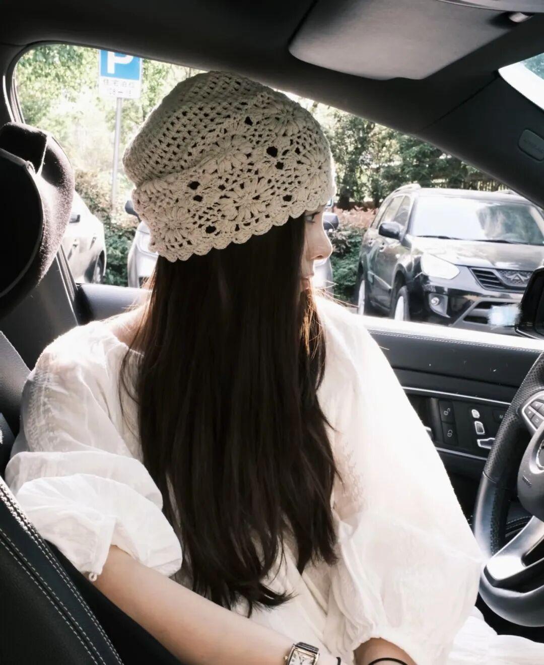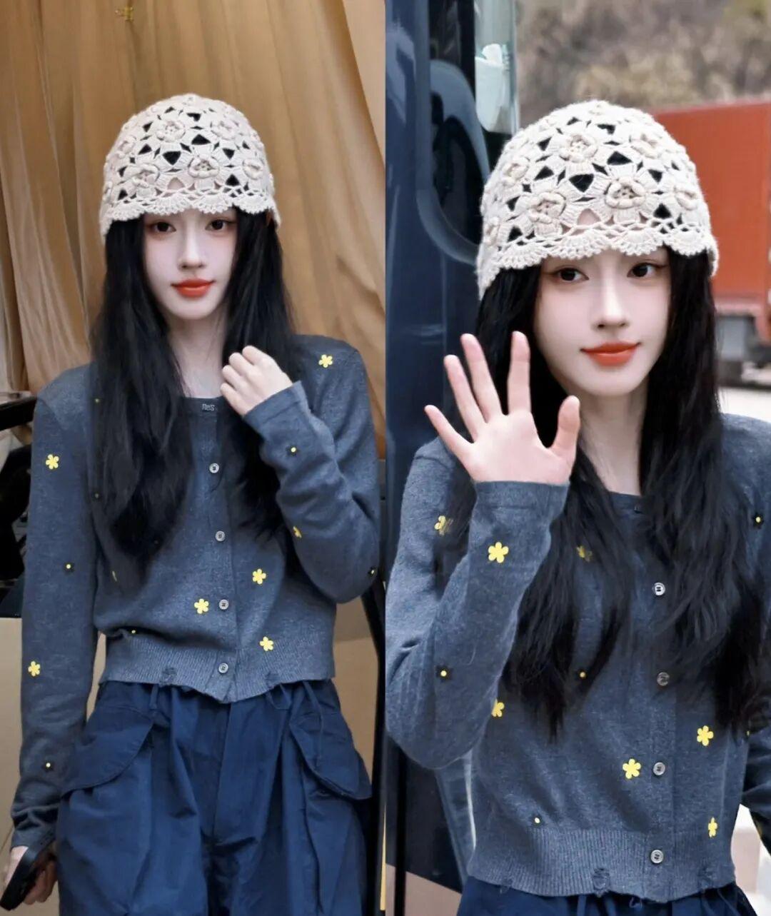 古道钩花镂空帽是小鞠带火的,就还蛮恰当她清秀工致的外形立场,虚心又淘气,像是把春日的花朵皆戴在了头上雷同。
