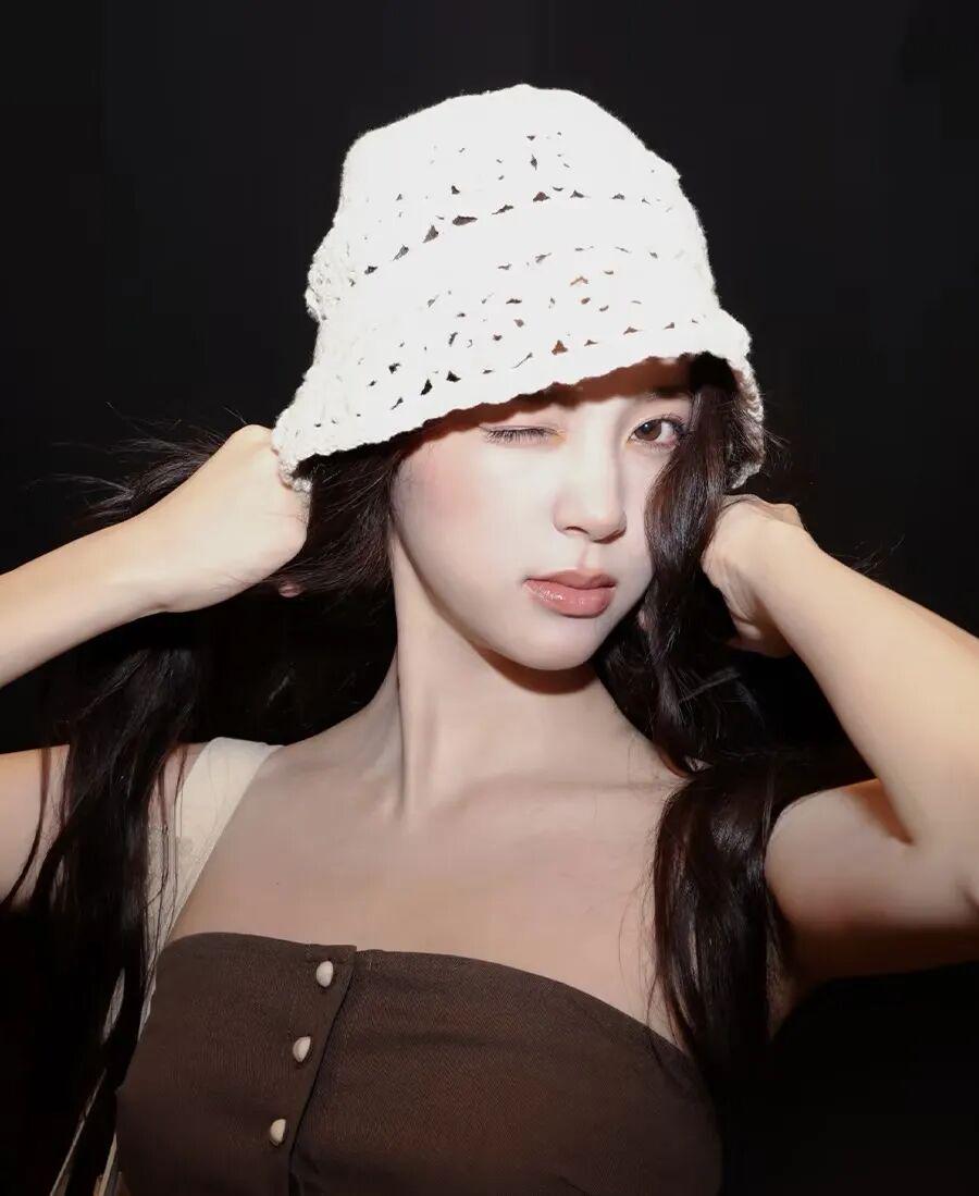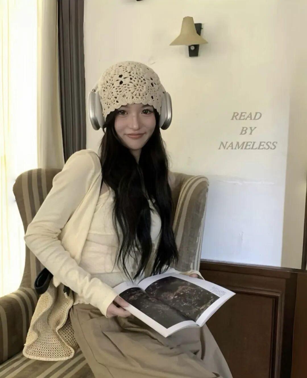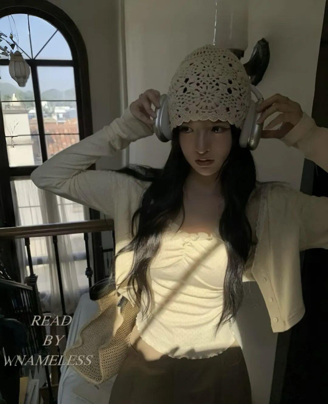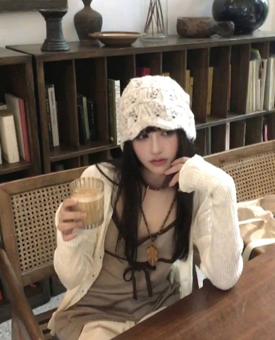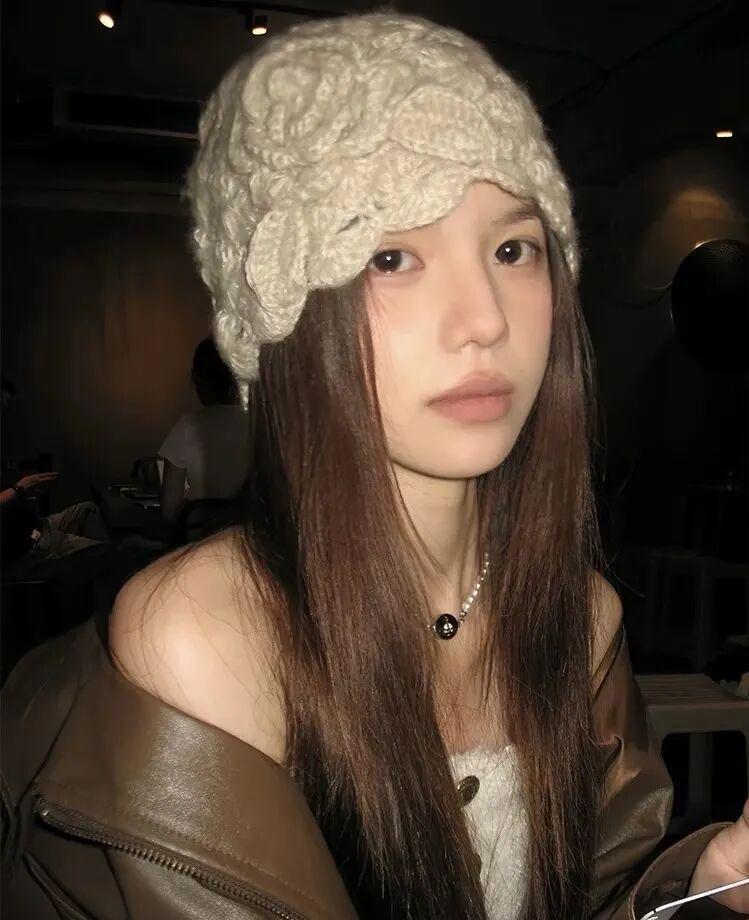 古道钩花镂空帽是小鞠带火的,就还蛮恰当她清秀工致的外形立场,虚心又淘气,像是把春日的花朵皆戴在了头上雷同。