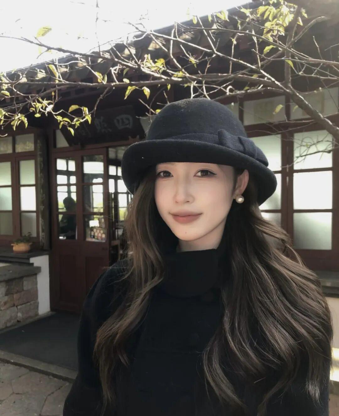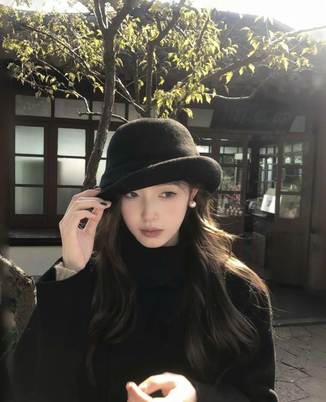 这种贴头皮帽子尤其恰当黑长直,一整套搭配起来几乎酷版南湘啊!