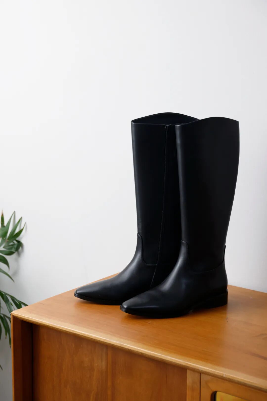 这是一对“大女主战靴”。玄色的小牛皮泛着高档晴明,细密的蓄意高档感满满,莫得任何鼓胀的遮拦,实足靠利落胜出。